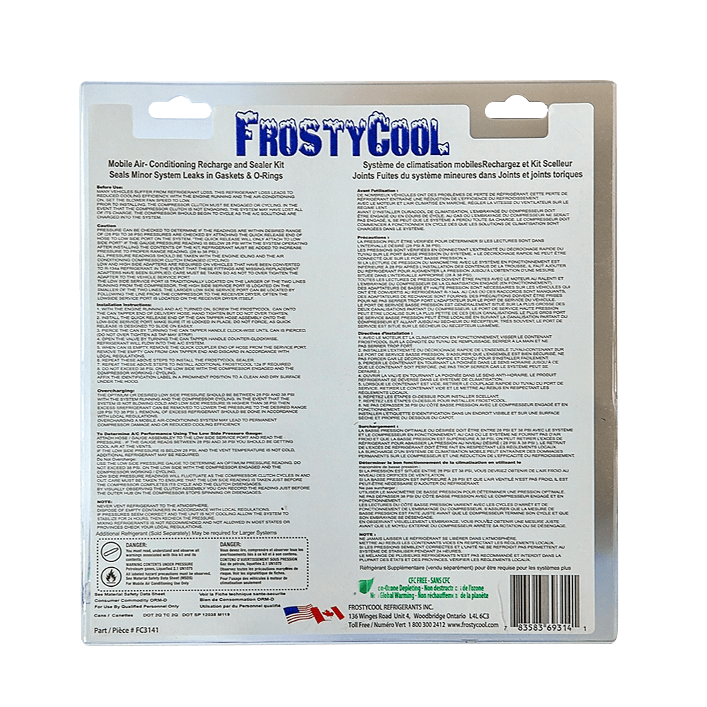 This kit is the perfect choice for charging systems and sealing leaks in rubber hoses, gaskets and “O” rings in today’s compact and sub compact vehicles with smaller air conditioning systems. Extra FrostyCool Refrigerant may be purchased separately if required for larger systems.