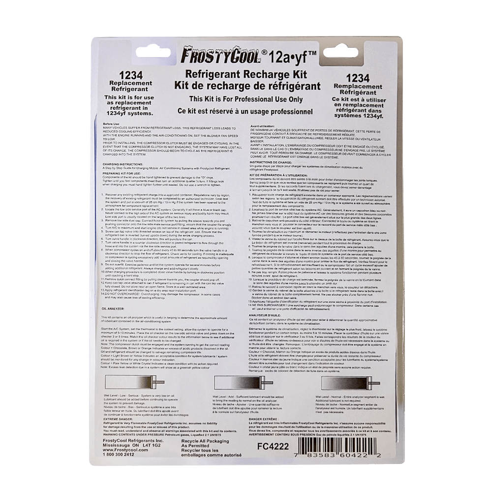Includes 2 Cans Refrigerant, 1 Can Stop Leak, Vent Thermometer, Goggles, Charging Hose, Gauge and Quick Connect and 2 Oil Checks