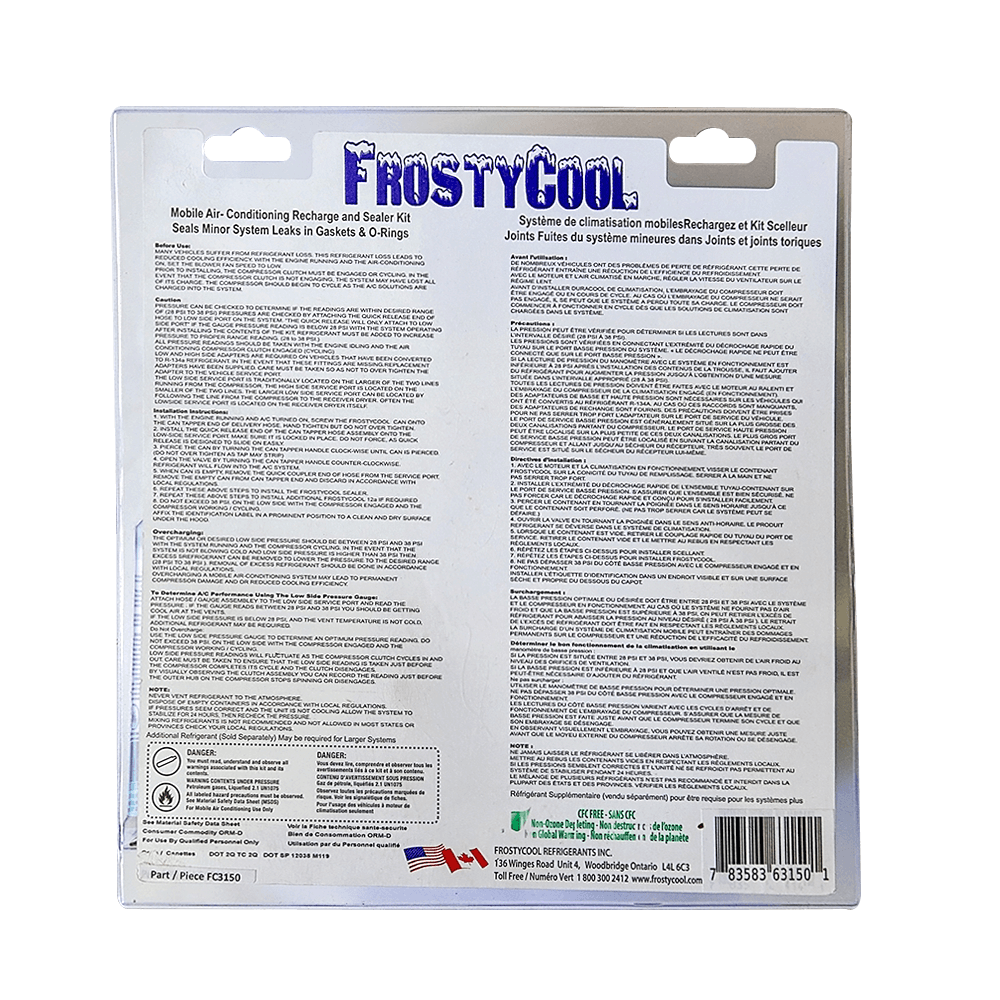 1 Can FrostyCool 12a – 1 Can FrostyCool A/C Stop Leak Trigger Hose with Gauge – Adapter Part Number FC3150 8 Kits Per Case RF Weld Packaging