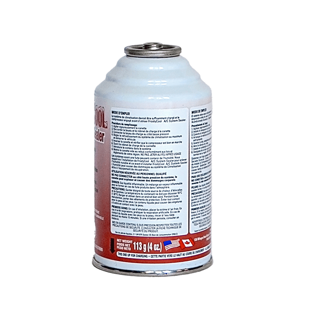 The 4 ounce FrostyCool A/C System Sealer contains 3.5 ounces of FrostyCool refrigerant which is equivalent to 10.5 ounces of R12 or 9.1 ounces of R134a.