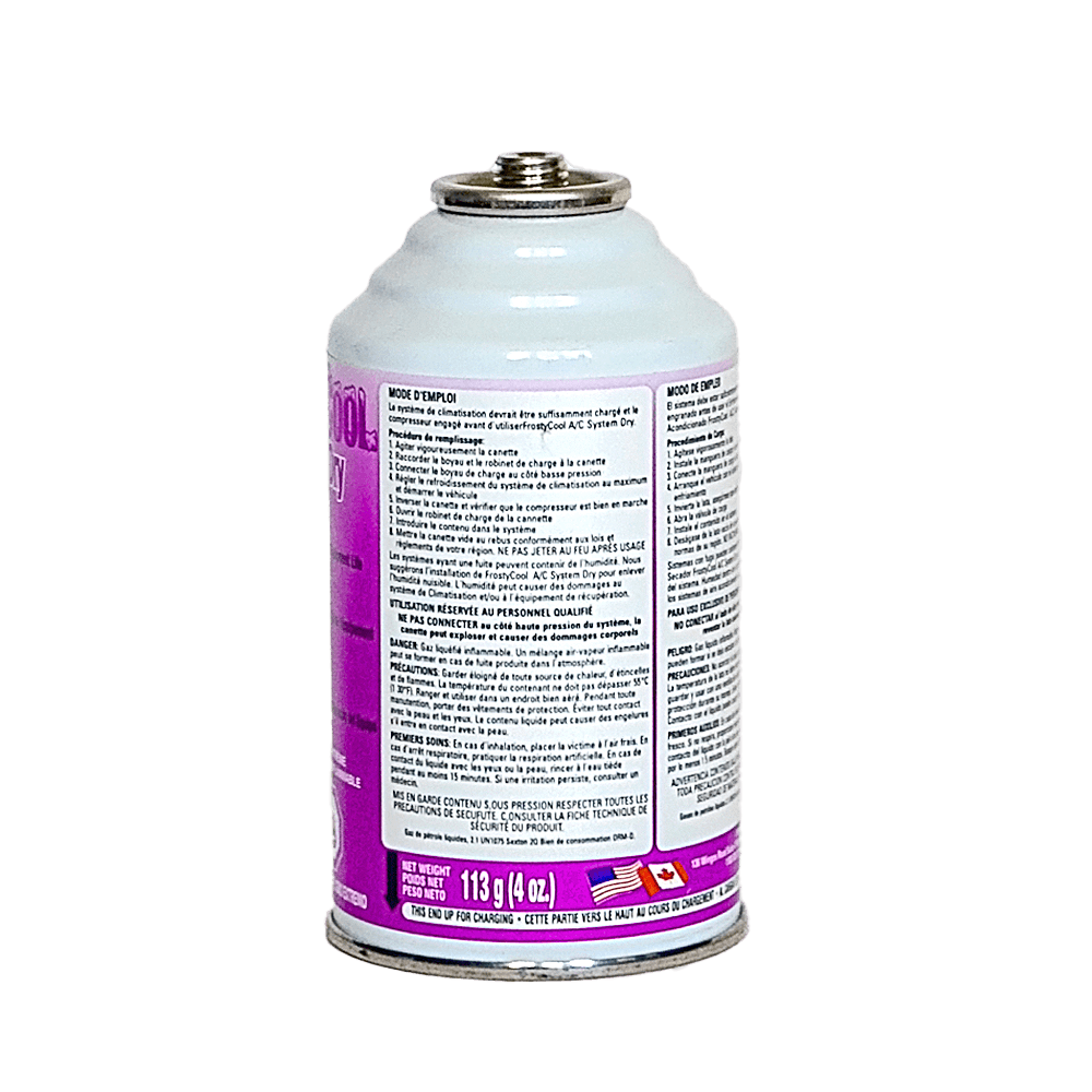 FrostyCool A/C System Dry combines with the moisture in a system forming a synthetic Lubricant. This helps to prevent corrosion and improves cooling capability by reducing harmful moisture in the system. FrostyCool A/C System Dry should be used before installing FrostyCool A/C System Sealer unless the system is evacuated.